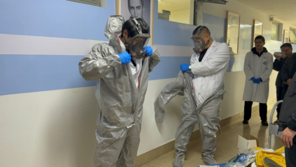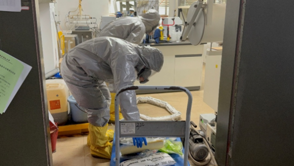 演练模拟实验过程中,一名研究生不慎打碎大瓶浓盐酸,导致衣裤鞋袜瞬间沾染大量盐酸。事发后,该生立即呼救,周围同学迅速向实验室负责人报告,并启动应急预案:第一时间将涉险同学转移至安全区域,协助其脱去被污染的衣物,随后使用喷淋洗眼装置对其受污染部位持续冲洗15分钟以上,初步清除污染物后送医进一步治疗。与此同时,实验室负责人赶到现场指挥应急处置。相关人员规范穿戴防护用品,使用专业材料对泄漏的浓盐酸进行围堵、控制,并完成规范收集与后续处理。