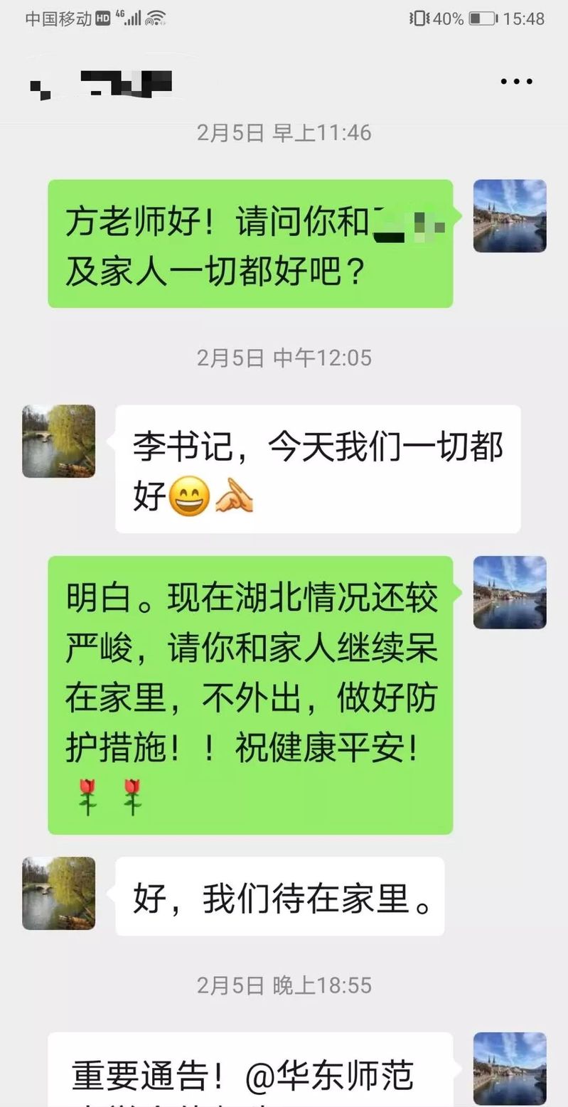 学院党委书记李恺密切关注疫情发展情况,提前部署学院疫情防控工作,坚持每天提醒教职工做好个人防护、居家隔离和心态调整,与在湖北等重点地区的师生及与从重点地区返沪教师一对一电话/微信联系,关心学院教师及家人身体状况。