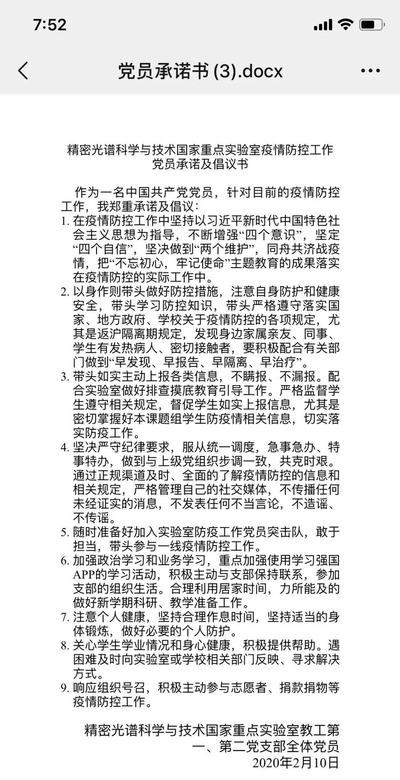 精密光谱科学与技术国家重点实验室第一教工党支部召开线上组织生活,成立党员突击队,明确人员分工,做好重点实验室远程连线,现场设备检查、安全防控、数据拷贝传输等紧急需求工作。