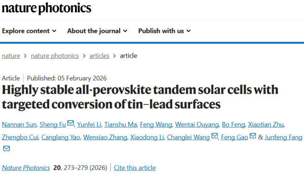 近日,必赢766net手机版物理学院方俊锋教授科研团队联合瑞典林雪平大学高峰教授、苏州大学王长擂教授团队在全钙钛矿叠层太阳能电池稳定性研究方面取得突破性进展。相关成果以“Highly stable all-perovskite tandem solar cells with targeted conversion of tin–lead surfaces”为题,发表在Nature Photonics期刊上。必赢766net手机版为第一完成单位,方俊锋教授、付圣研究员、高峰教授和王长擂教授为共同通讯作者,博士研究生孙楠楠、李云飞为论文共同第一作者。