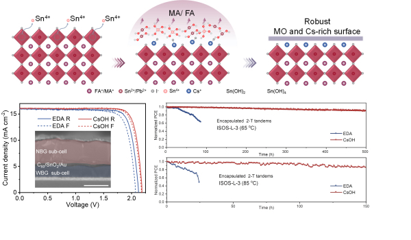 在化学驱动力作用下,CsOH 引导亚稳态、高缺陷的表面发生定向转化:一方面将有害的 SnI₄与缺陷位点转化为高稳定性金属氧化物(MO)保护层;另一方面以 Cs⁺取代易挥发的有机阳离子(MA⁺/FA⁺)填充钙钛矿 A 位空位,形成铯基端接的强化晶格结构。
