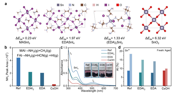 核心难点在于,锡铅(Sn-Pb)钙钛矿表面固有的高化学活性,易发生自氧化生成 SnI₄等有害产物。同时,传统分子钝化策略所依赖的有机胺分子,在高温光照条件下易扩散与挥发,无法实现长期保护功效,这已成为制约器件光热稳定性的关键。