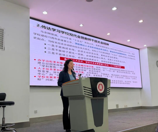 李恺传达了学校2026年寒假务虚会及“双代会”暨教师干部大会精神。她指出,学校明确了“一坚定四卓越”的最新定位,将拔尖创新人才自主培养作为“十五五”改革发展的“牛鼻子”,聚力“八大攻坚”,着力实现“三个同频共振”。学校求变应变的魄力与决心十分强劲,为“十五五”发展擘画了蓝图,目标明确、路径清晰。学院要主动对标学校要求,重点在“怎么做”“怎么落”上下功夫,科学谋划“十五五”发展,高质量落实学校各项工作部署。学院将以人才培养为牵引,积极谋划、主动作为,力争实现新发展。全院教职工要凝聚共识,将个人发展的“小逻辑”全面融入学院、学校发展的“大逻辑”, 在教学科研中找准定位、干出实绩。
