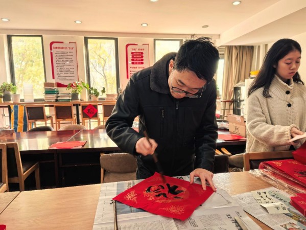 在“翰墨写春”区域,同学们将对新年的期许融入笔端。有的同学书写下气势饱满的“福”字,祝愿学研并进;有的则创作出意蕴吉祥的联句,字里行间跳动着“科研顺利、成果丰硕”的真挚愿望。红纸黑字间暖意涌动,喝彩声此起彼伏,大家在墨香中共同祈愿来年万事顺遂。