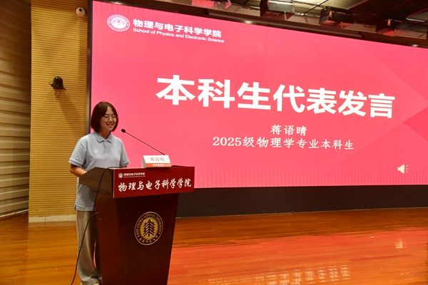 蒋语晴同学则以“求实创造,为人师表”的校训为指引,表达了对大学生活的憧憬。她表示:“站在新起点,我们要保持对未知的探索欲,用物理思维解读世界运行的规律;要坦然拥抱挫败感,在一次次挑战中认清自我、超越自我;更要常怀感恩之心,铭记成长路上每一份支持与陪伴,争做物理知识的卓越传播者。”“五湖四海的我们,因物电学院相聚,这里既有深厚的人文底蕴,更有严谨的科学精神。”