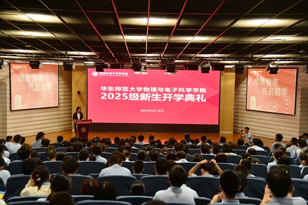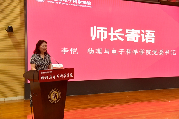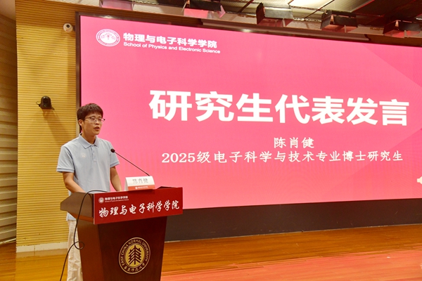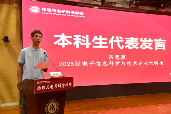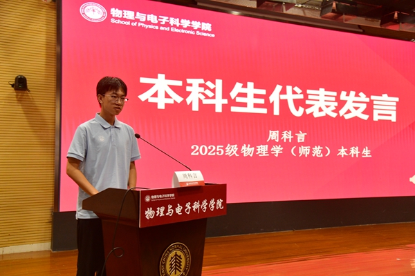 李恺深情回顾了学院七十余年的发展历程。她指出,七十余年里,学院始终传递着“求实创造”的信念,秉持着为国育才的初心,以培育卓越人才为己任。面对世界百年未有之大变局,李恺表示,物理学与电子科学作为驱动科技创新,支撑国家发展的核心学科,战略意义愈发凸显。因此,学院将不断优化学科布局、强化师资队伍建设,为学子们搭建夯实专业基础、拓宽学术视野的平台。她郑重承诺,学院的导师、高年级的学长学姐,都将尽己所能,在挫折时给予鼓励,在陌生环境中尽快找到归属感。她温暖勉励2025级新生,要以热爱科学的赤诚之心、坚韧不拔的奋斗之志、向上包容的进取之态,锤炼品格、增长才干,努力成为专业扎实、理想坚定、勇于担当的物电人与师大人。学院永远是同学们最坚实的后盾,将全力支持同学实现梦想、为社会贡献力量。