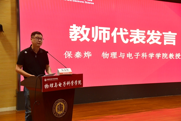 2025年度新时代青年先锋奖、上海市五四青年奖章获得者保秦烨教授作为教师代表发言。保秦烨回顾了自己二十年前的求学经历,他强调,大学是人生中至关重要的成长节点,这段时光将深刻影响未来的人生方向。 “如何过好大学生活”?保秦烨为新生提出建议:其一,做永葆好奇之心的追问者。在保秦烨看来,好奇心是“内卷”的精神解药,是抵御躺平的精神动力。他鼓励同学们从课堂疑问、实验异常、读书困惑中寻找研究起点,始终保持对世界的探索热情;其二,做拥抱失败挫折的奋进者。他坦言,物理与电子科学领域的学习与研究相当不易,但是,挫折是进步的必经之路,只有提升抗挫折能力、学会从失败中汲取经验,才能敢于挑战从0到1的科研难题;其三,做心怀理想信念的追光者。结合“求实创造、为人师表”的校训,他寄语未来投身教育事业的同学要夯实专业基础、锤炼教学技能,成为照亮学生成长的好老师。保秦烨同时勉励选择科研赛道的同学善用学院的优质资源,沉下心来搞研究,务实创新,真正做有价值、有意义的学术探索。