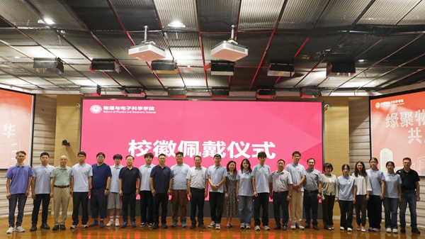 新生代表发言结束后,典礼进入庄重的校徽佩戴环节。学院领导、教师代表依次为2025级新生代表佩戴校徽,小小的校徽承载着期望,也让新生们深切感受到身为“师大物电人”的责任。