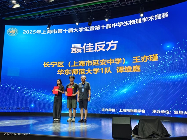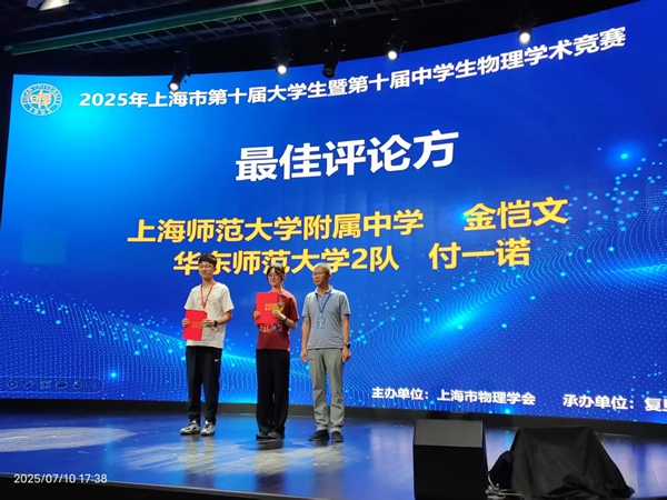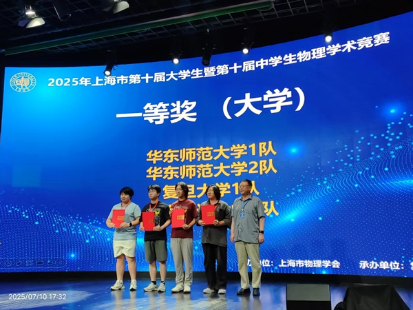 7月8日至10日,上海市第十届大学生及中学生物理学术竞赛于复旦大学成功举办。由我院2024级本科生组成的两支代表队积极参与了此次赛事,两支队伍表现出色,分别以前三轮总分第一名和第三名的成绩,荣获一等奖的第一名和第二名。此外,谭维庭同学荣获最佳反方奖,付一诺同学则获得了最佳评论方奖。